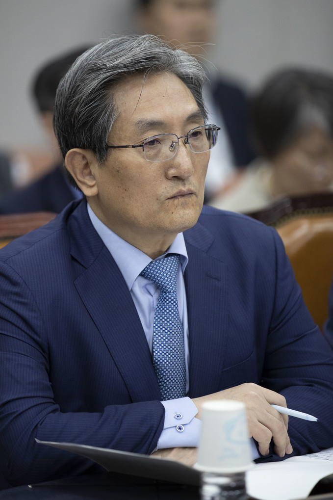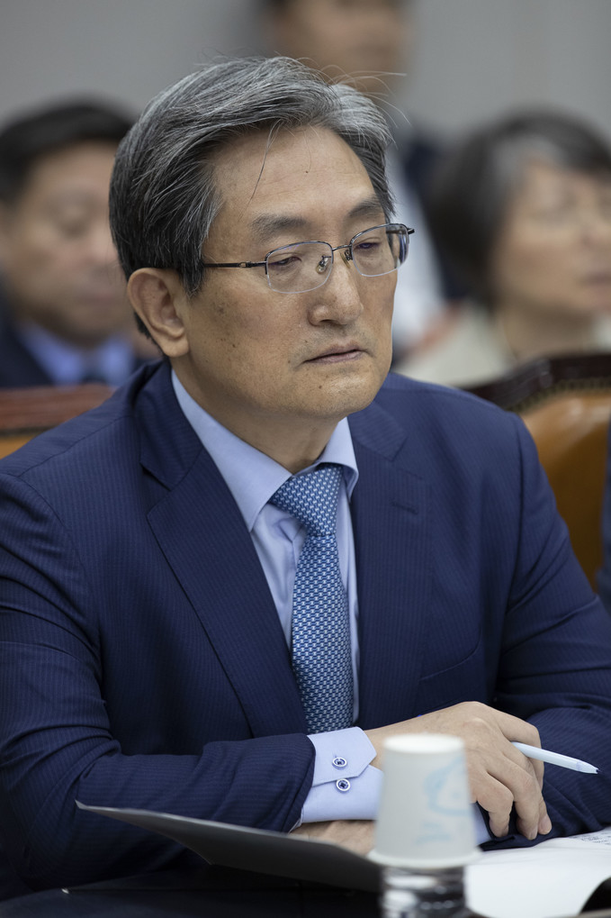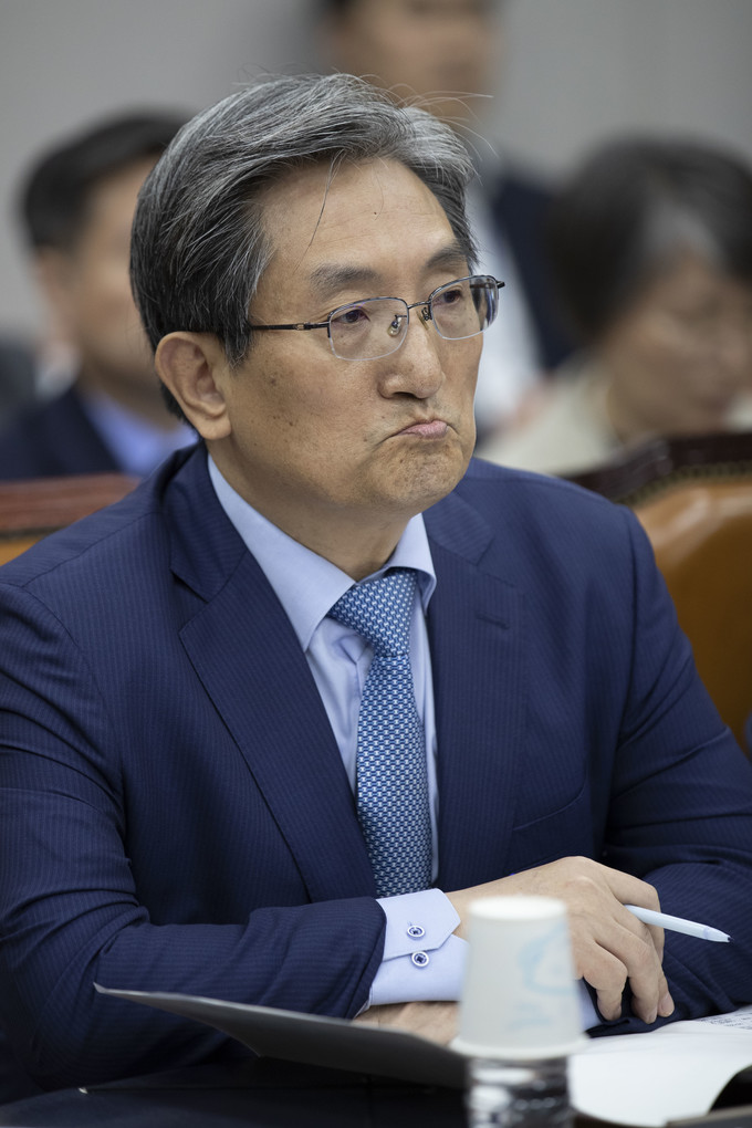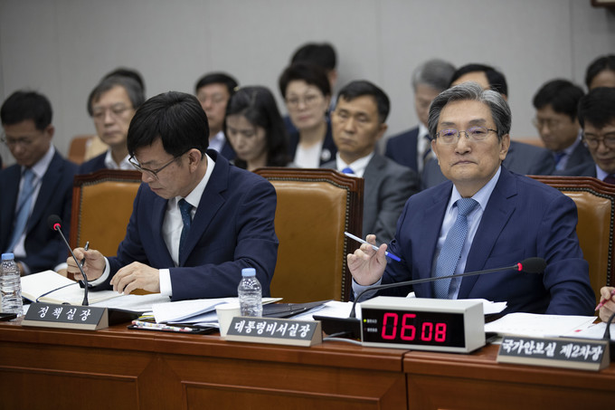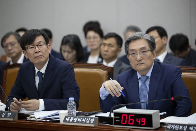 노영민 대통령비서실장(오른쪽)이 6일 오전 서울 여의도 국회에서 열린 운영위원회 전체회의에 출석해 의원질의를 듣고 있다.