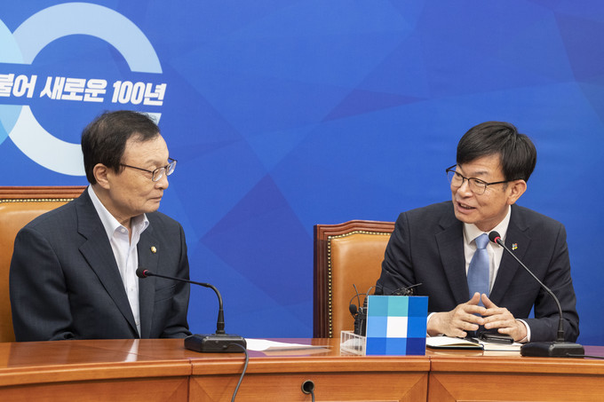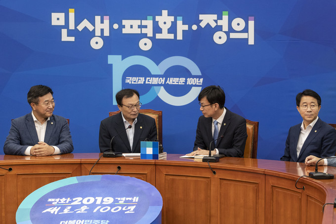 김상조 청와대 정책실장(오른쪽)이 28일 오전 서울 여의도 국회 더불어민주당 당대표실을 예방해 이해찬 대표와 대화를 하고 있다.