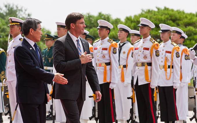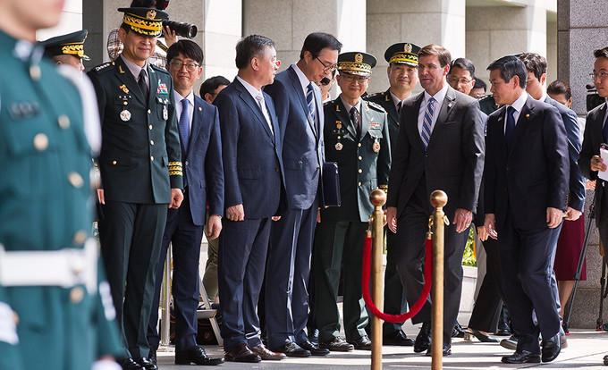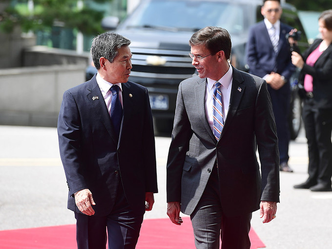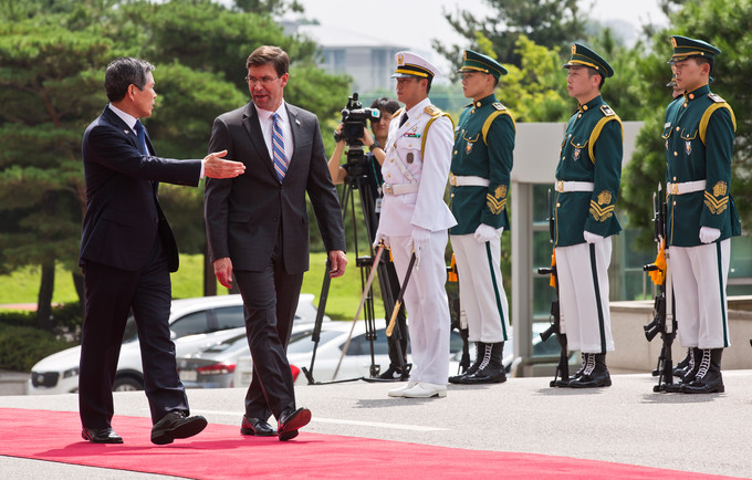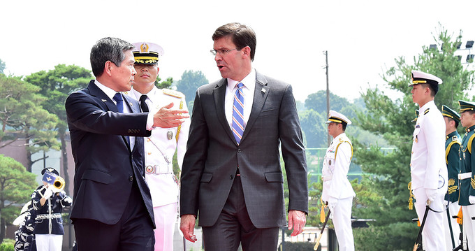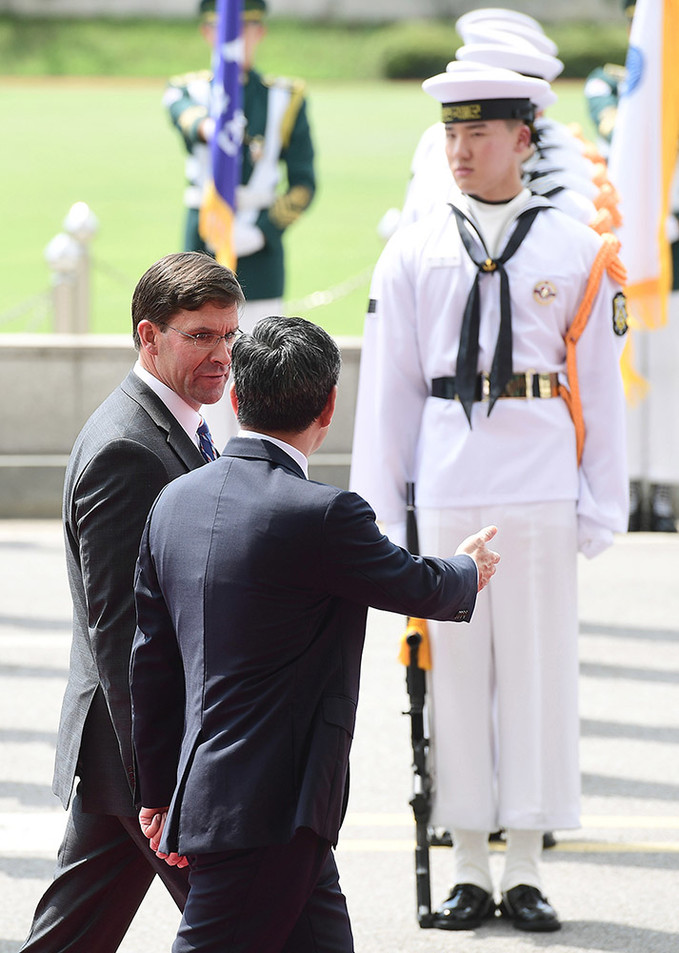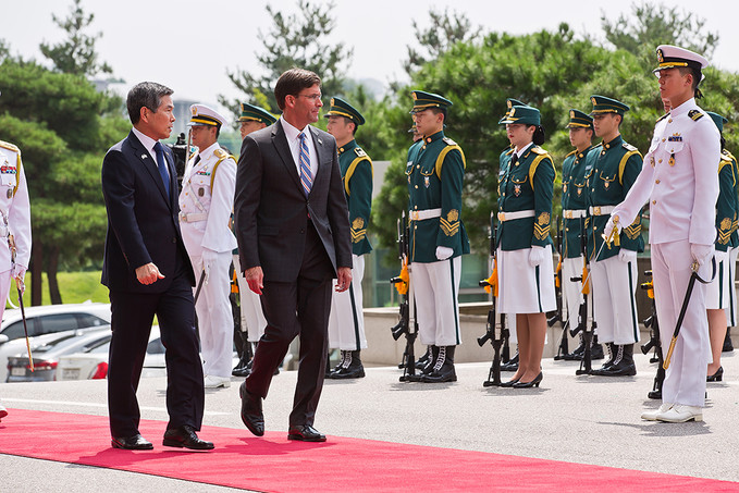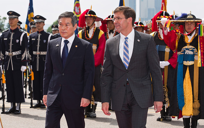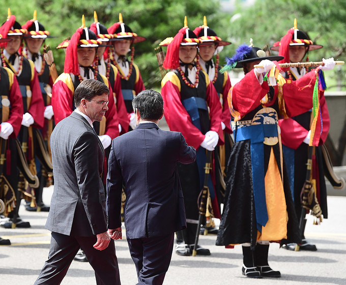 정경두 국방부장관(왼쪽)과 마크 에스퍼 미국 신임 국방장관이 9일 오전 서울 용산구 국방부에서 열린 의장행사에서 사열을 받고 있다.