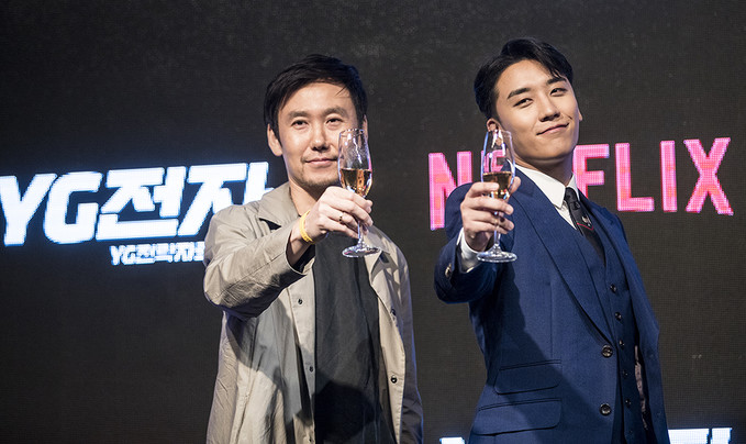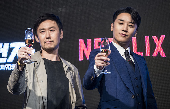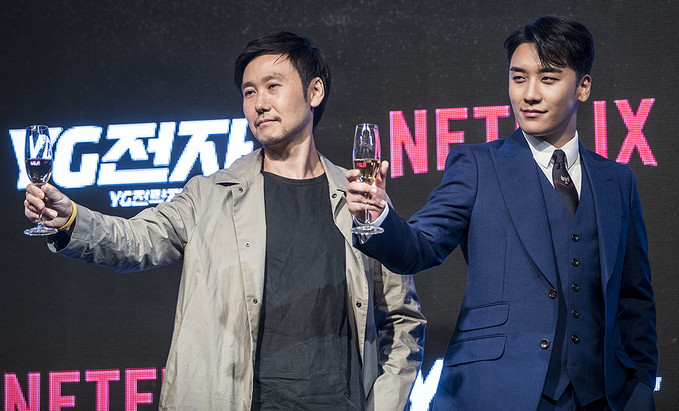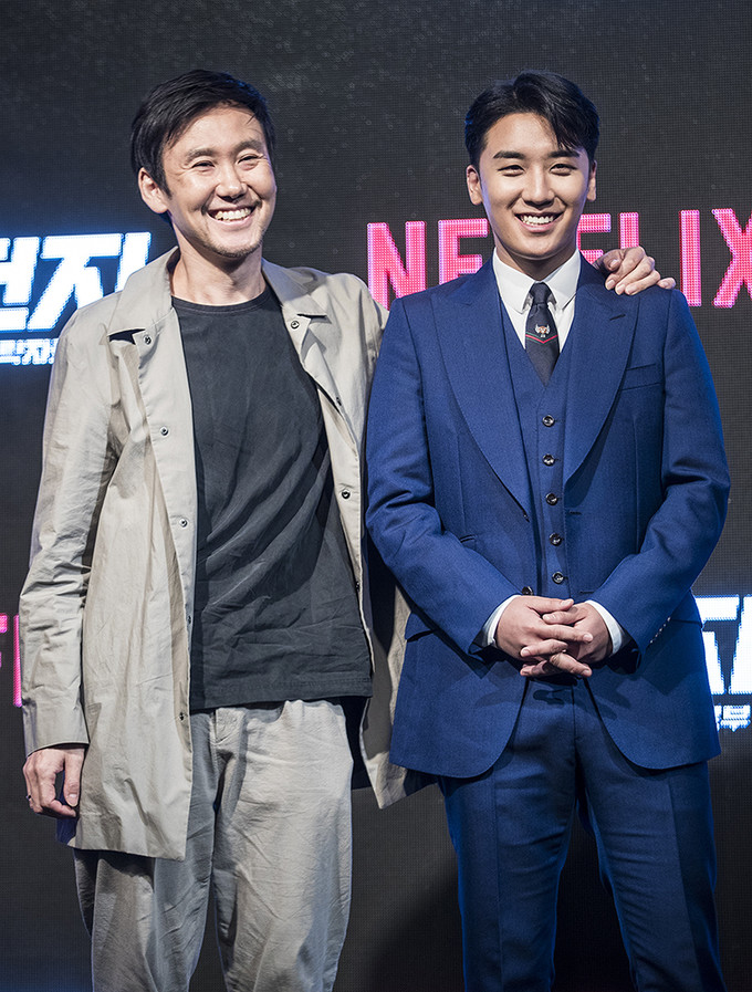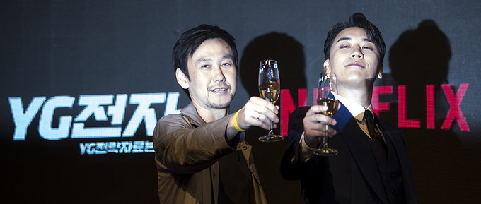 빅뱅 승리와 박준수PD가 1일 오전 서울 종로구 JW매리어트호텔 동대문스퀘어에서 열린 넷플릭스의 신작 리얼 시트콤 'YG전자' 제작발표회에서 포즈를 취하고 있다. 'YG전자'는 하루 아침에 기피 1순위 부서인 'YG전략자료본부'로 좌천된 승리가 위기의 'YG엔터테인먼트'를 살려내고 다시 회장님의 품으로 돌아가기 위해 고군분투하는 리얼 시트콤이다.