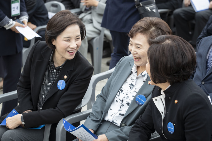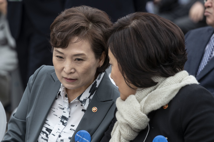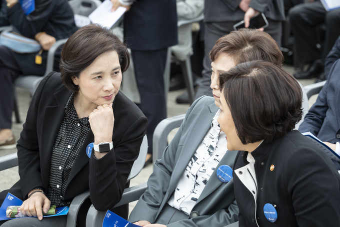 유은혜 사회부총리 겸 교육부 장관(왼쪽부터), 김현미 국토교통부 장관, 박영선 중소벤처기업부 장관이 19일 오전 서울 강북구 국립4.19민주묘지에서 열린 제59주년 4·19혁명 기념식에서 인사하고 있다.