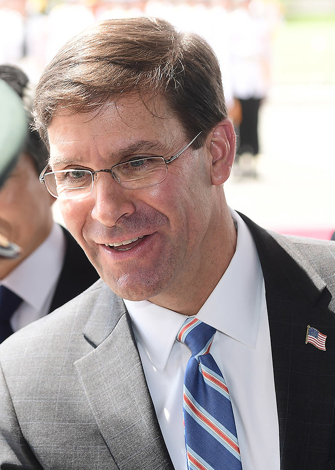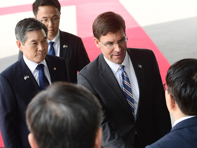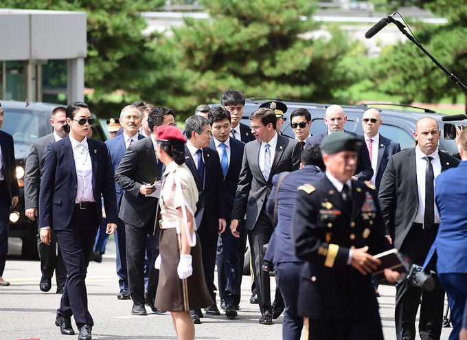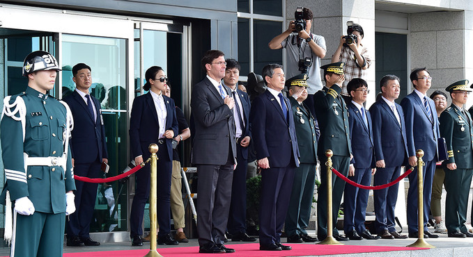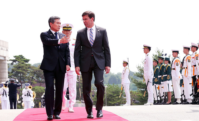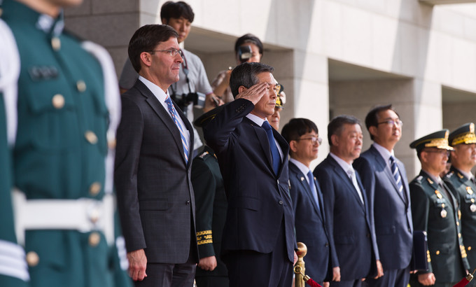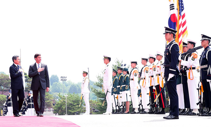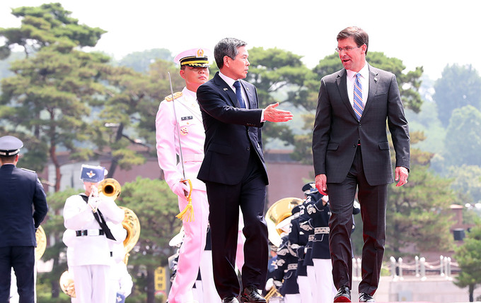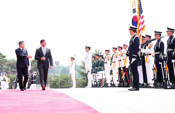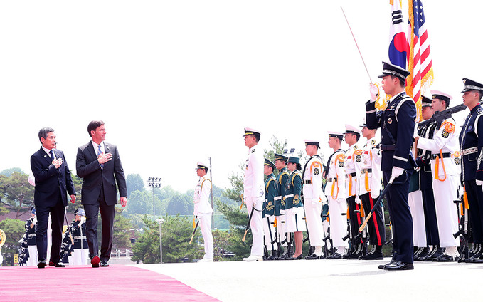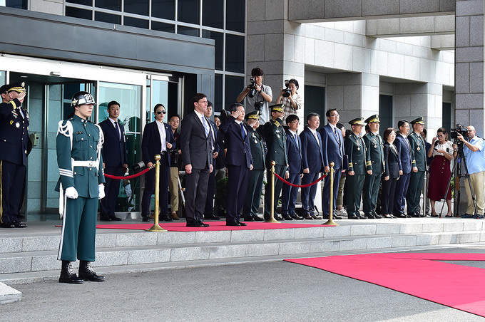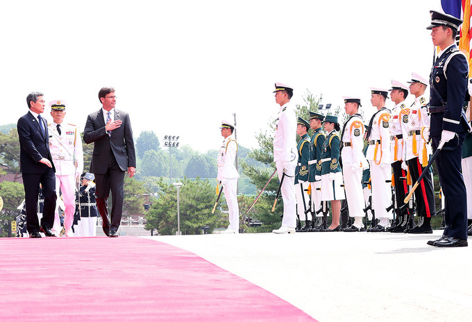 정경두 국방부 장관과 마크 에스퍼 미국 국방부 장관이 9일 서울 용산 국방부 청사에서 열린 한-미 국방 장관과의 회담에 앞서 의장대 사열을 받고 있다.