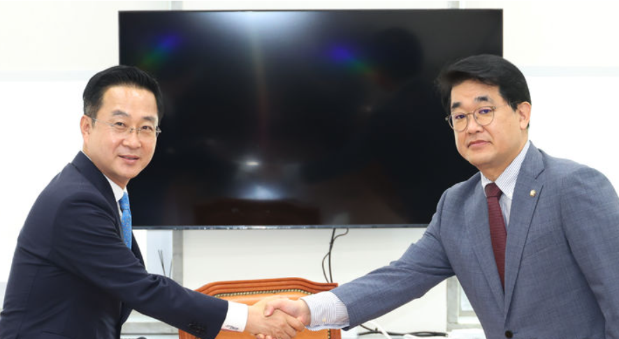 | ▲ 국민의힘 배준영(오른쪽), 더불어민주당 박성준 원내수석부대표가 8일 국회에서 민생법안 처리를 위한 협의체 운영방식을 논의하기 위해 만나 악수하고 있다. [뉴시스] |