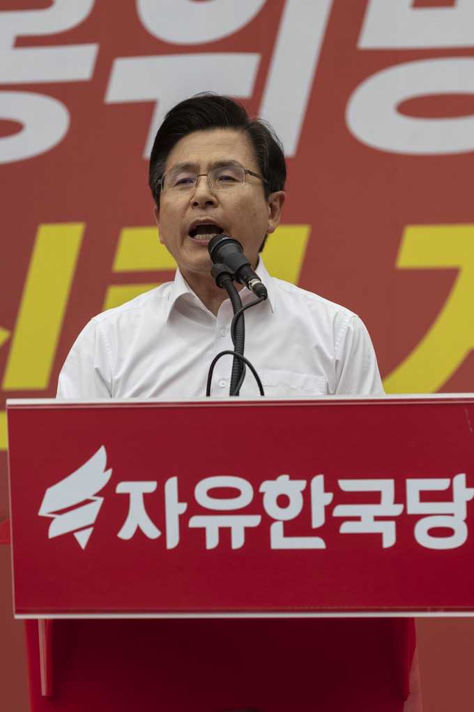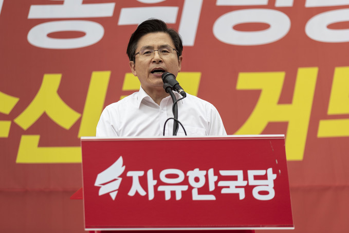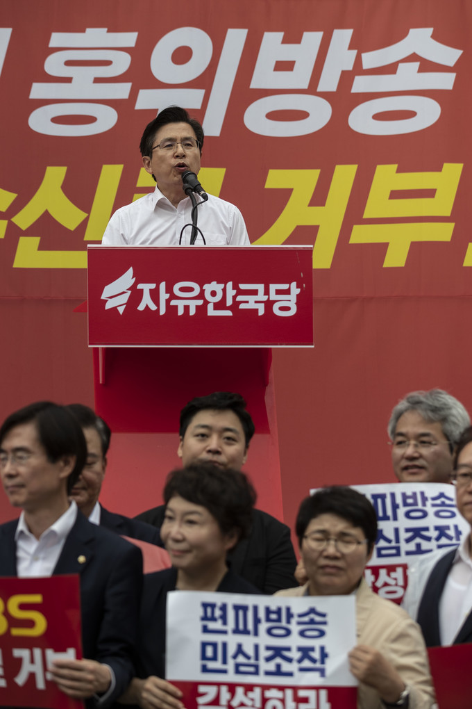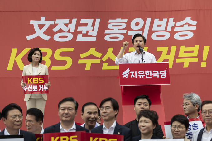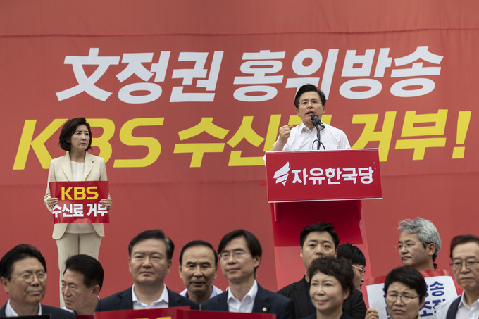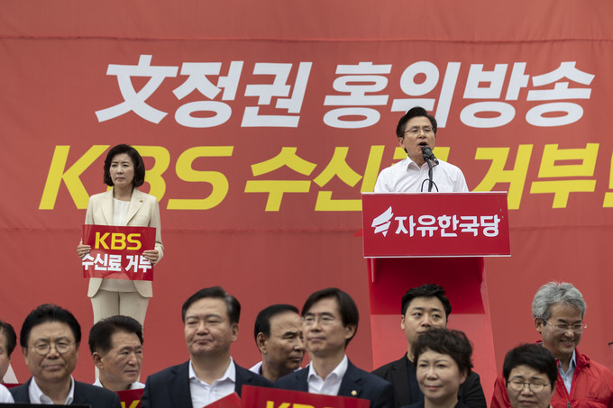 자유한국당 황교안 대표가 25일 서울 여의도 국회의사당역 앞에서 열린 'KBS편파방송, 수신료 거부를 위한 전국민서명운동 출정식'에 참석해 발언하고 있다.