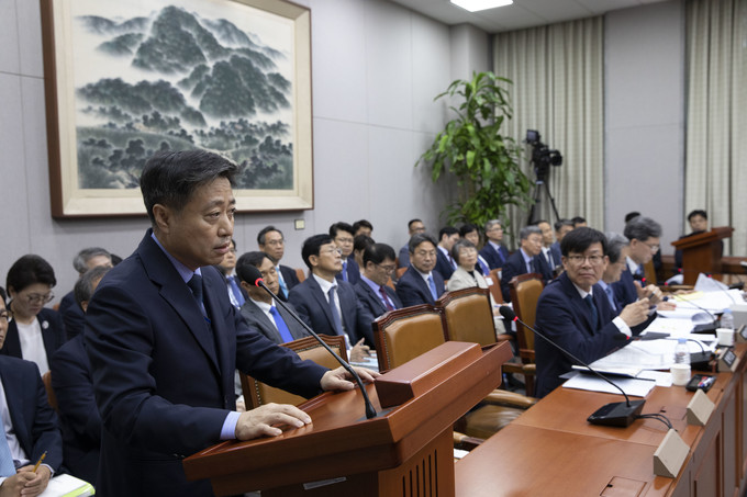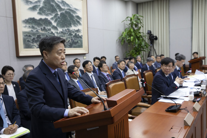 윤도한 국민소통수석비서관이 6일 오전 서울 여의도 국회에서 열린 운영위원회 전체회의에 출석해 의원질의에 답하고 있다.