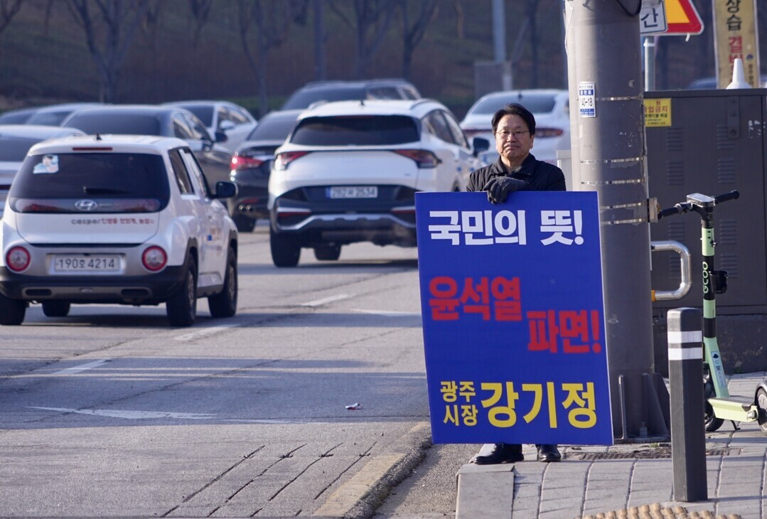 | ▲ 강기정 광주광역시장이 지난달 11일 아침8시 시청 앞 5·18기념공원 교차로에서 '윤석열 파면' 피켓을 들고 1인 시위에 나서고 있다. [강기정 광주시장 제공] |