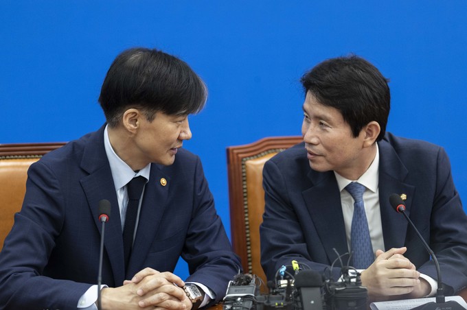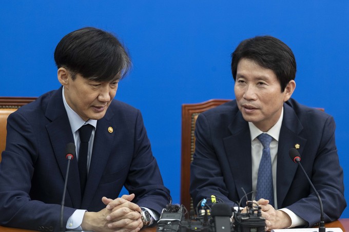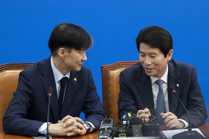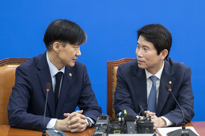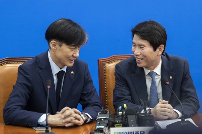 조국 법무부장관(왼쪽)이 17일 오전 서울 여의도 국회 더불어민주당 원내대표실에서 이인영 원내대표를 예방하고 있다.