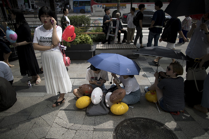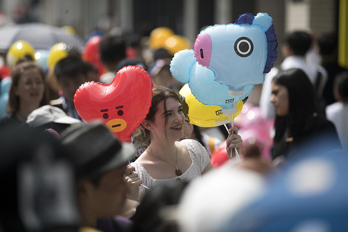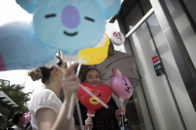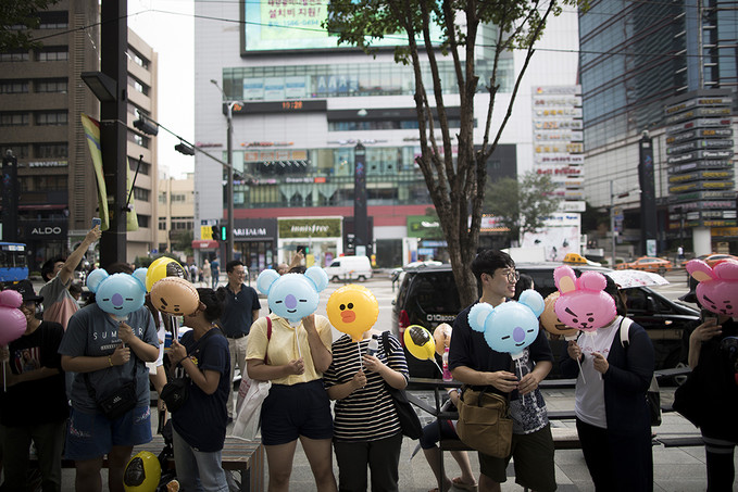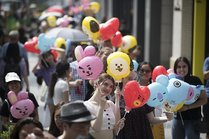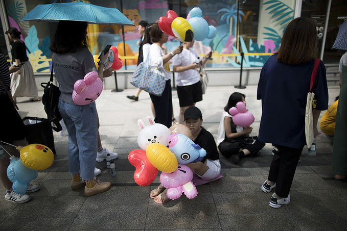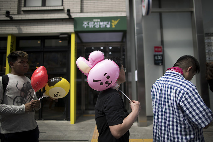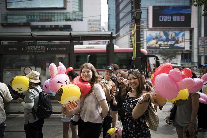8일 서울 강남구에 오픈한 '라인프렌즈 플래그십 스토어 강남점'에서 라인프렌즈 캐릭터 풍선을 든 외국인 관광객과 시민들이 매장으로 들어가기 위해 줄지어 서있다.
