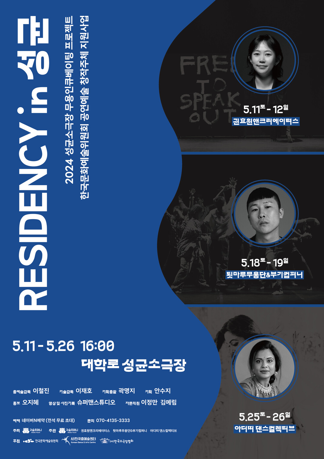대학로 유일의 무용 전용 공간 성균소극장에서 2024년 새롭게 선보이는 프로젝트 'RESIDENCY in 성균'에 선정된 '권효원앤크리에이터스', '툇마루무용단&부기컴퍼니', '아디띠 댄스컬렉티브'가 11일부터 26일까지 매주말 공연을 갖는다.