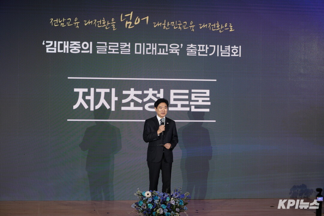 | ▲ 김대중 전남교육감이 29일 목포축구센터에서 순천과 나주에 이은 세 번째 출판기념회인 '글로벌기업이 주목하는 AI에너지교육밸리'란 주제로 글로컬 미래교육에 대해 전남교육 가족에게 설명을 하고 있다. [강성명 기자] |