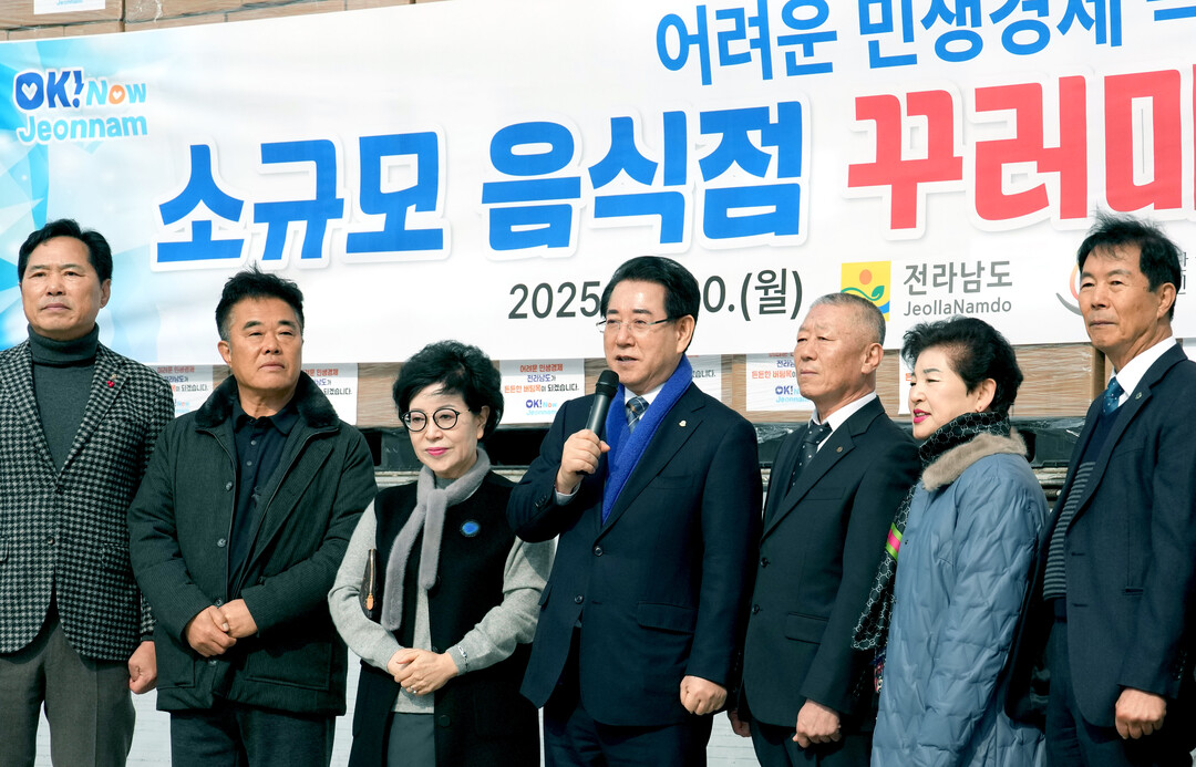 | ▲ 김영록 전라남도지사가 20일 전남도청 만남의 광장에서 열린 어려운 민생경제 극복을 위한 '소규모 음식점 꾸러미·공공요금 지원' 행사에서 인사말을 하고 있다. [전남도 제공] |