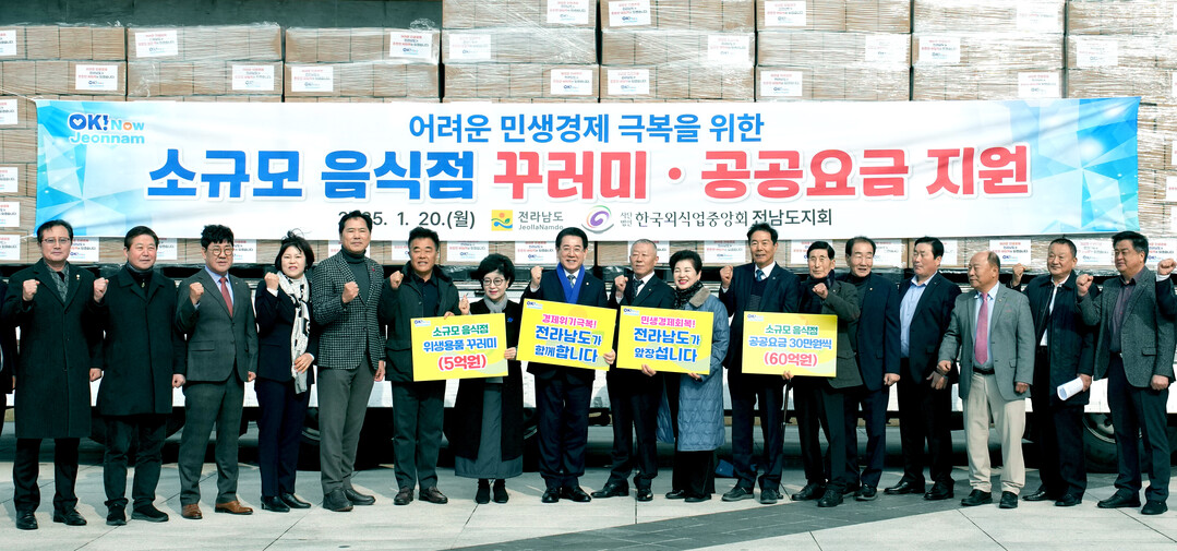 | ▲ 김영록 전라남도지사가 20일 전남도청 만남의 광장에서 열린 '소규모 음식점 꾸러미·공공요금 지원' 행사에서 참석자들과 경기침체 장기화로 어려움을 겪고 있는 음식점들의 민생경기 조기회복을 위한 퍼포먼스를 하고 있다. [전남도 제공] |
