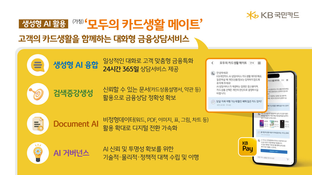 KB국민카드는 금융당국이 발표한 금융 분야 망 분리 개선 로드맵에 따라 개발 중인 생성형AI를 활용한 '모두의 카드생활 메이트'가 지난 9일 혁신금융서비스로 지정됐다고 밝혔다.