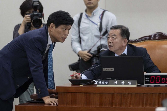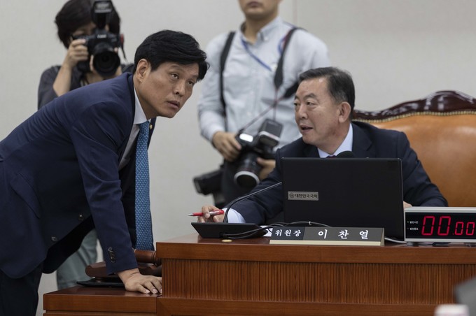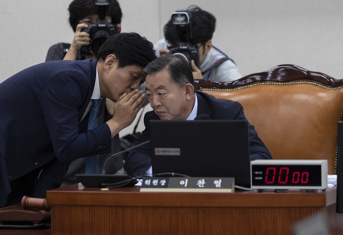 바른미래당 소속 이찬열 위원장(오른쪽)과 민주당 소속 조승래 간사가 24일 오후 서울 여의도 국회에서 열린 교육위원회 전체회의에 참석해 대화를 하고 있다