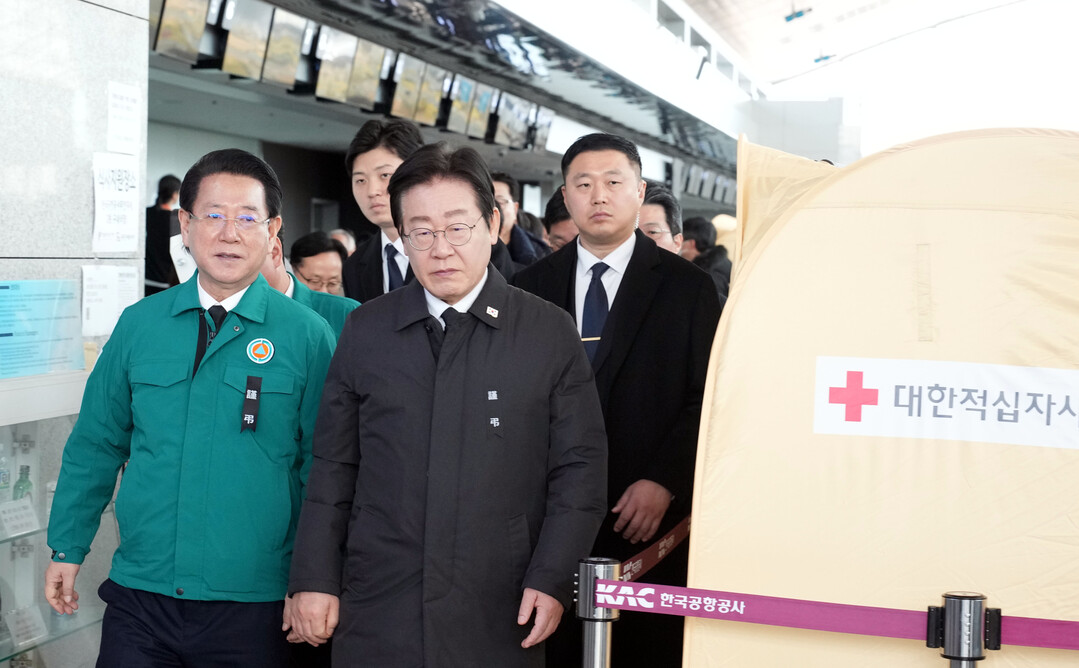| ▲ 2일 오전 이재명 더불어민주당 대표와 김영록 전라남도지사가 무안공항에서 제주항공 여객기 사고 유가족 비상대책위원들과 면담을 마치고 이동하고 있다. [전남도 제공] |