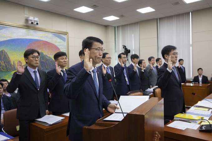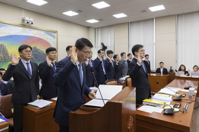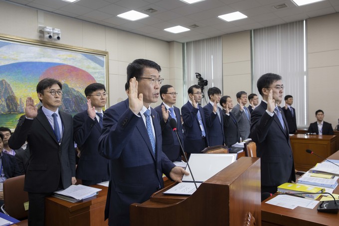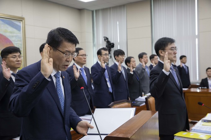 은성수 금융위원회 위원장이 4일 서울 여의도 국회에서 열린 정무위원회 금융위 국정감사에 출석해 선서를 하고 있다.