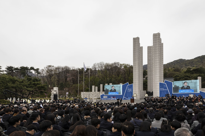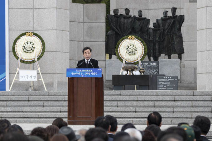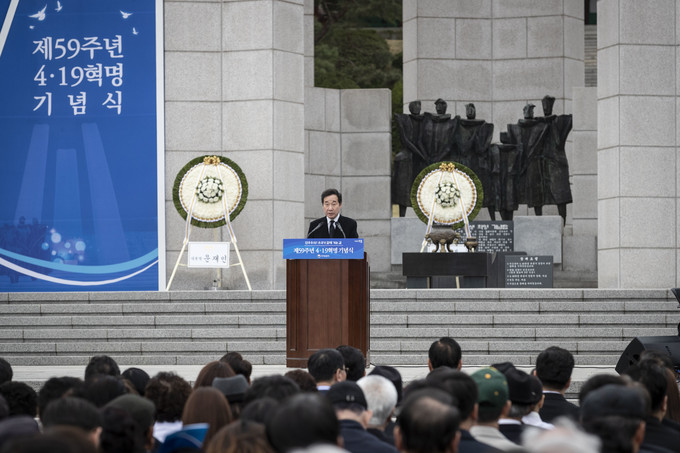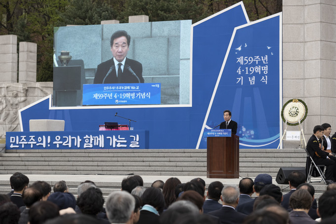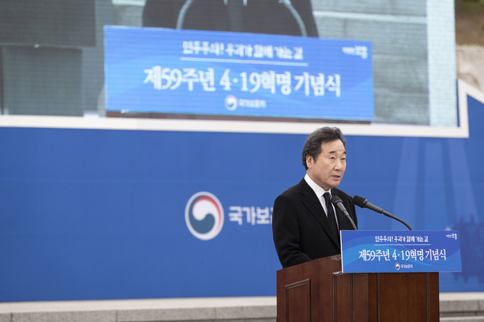이낙연 국무총리가 19일 오전 서울 강북구 국립 4·19 민주묘지에서 열린 제59주년 4·19혁명 기념식에 참석해 기념사를 하고 있다.
