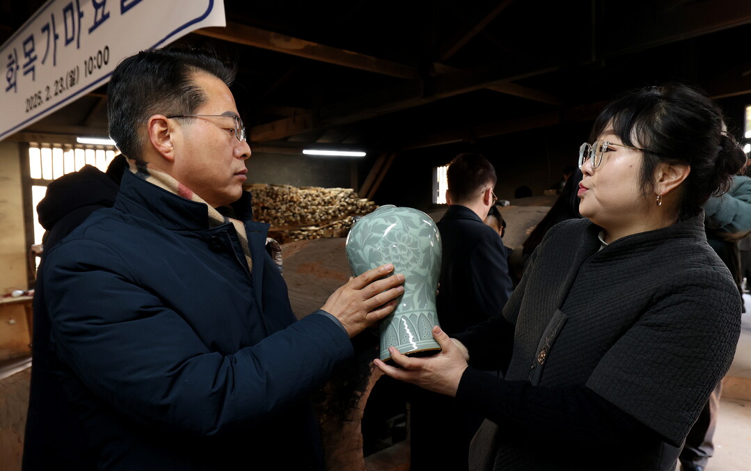 | ▲ 이병철 강진군부군수가 23일 고려청자박물관 제2호가마에서 전통방식으로 48시간동안 구워낸 청자를 꺼낸 뒤 영롱한 천년 비색에 감탄을 하고 있다. [강진군 제공] |