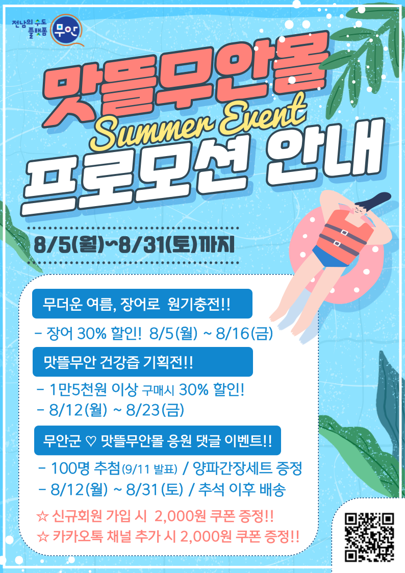 신규 회원을 위한 혜택도 준비돼 있다. 맛뜰무안몰에 가입하는 모든 신규 회원에게 2000원 쿠폰 증정(8월 5일~31일), 카카오 채널 친구 추가 시 2000원 할인 쿠폰을 상시 제공한다.