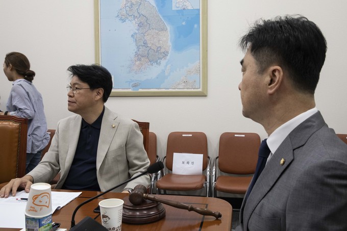 김종민 정치개혁특별위원회 안건조정위원장(오른쪽)이 28일 오전 서울 여의도 국회에서 열린 정개특위 회의에서 자유한국당 장제원 간사를 바라보고 있다.