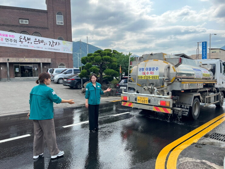 | ▲ 정둘순 산청읍장이 도로변 살수차를 점검하고 있다. [산청군 제공] |