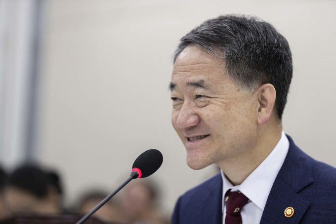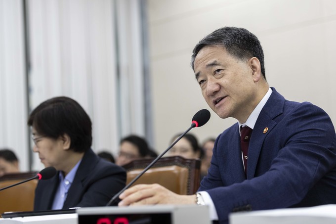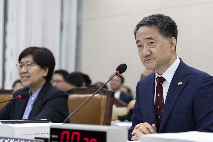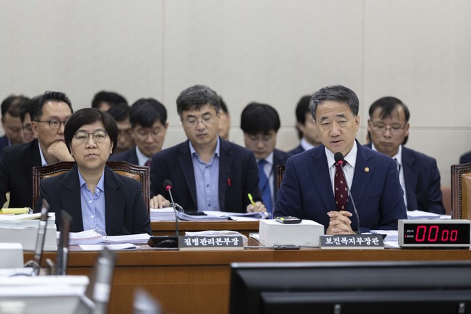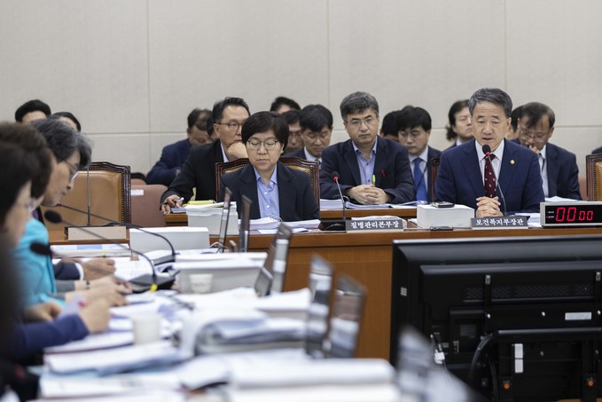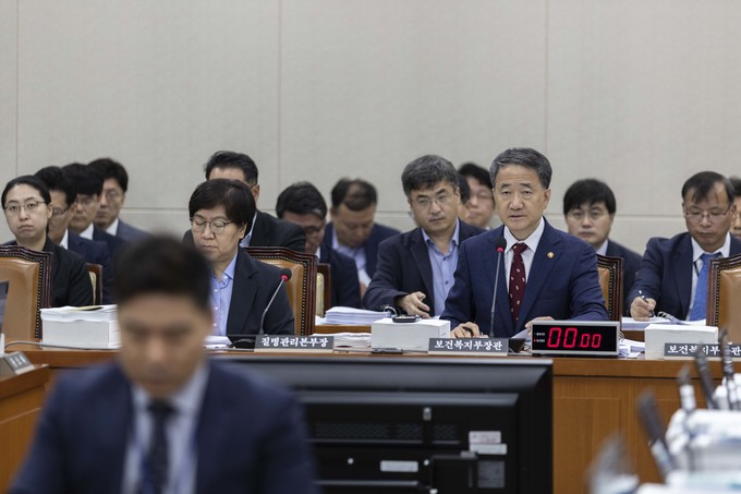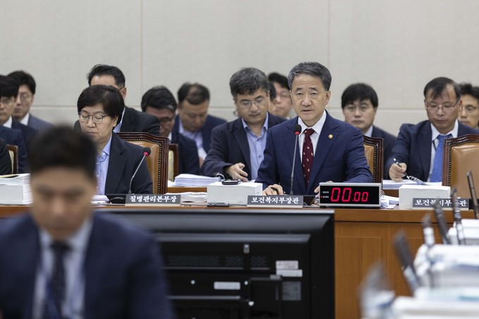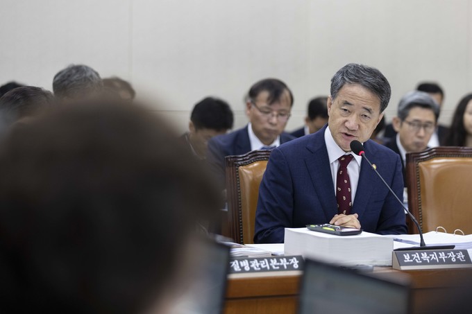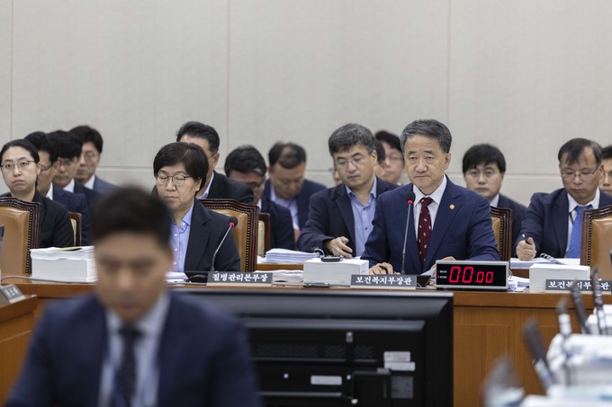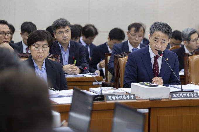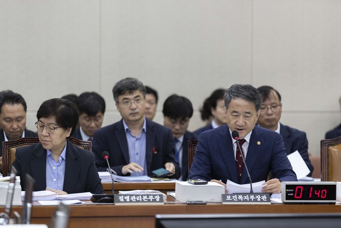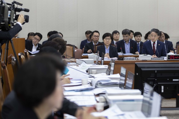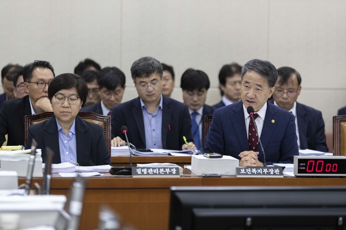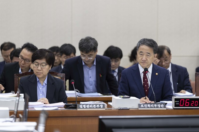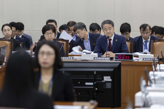 박능후 보건복지부 장관이 2일 오전 서울 여의도 국회에서 열린 보건복지위원회 국정감사에 출석해 의원 질의에 답하고 있다.