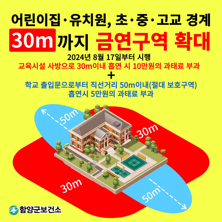 함양군은 국민건강증진법 개정에 따라 오는 17일부터 관내 어린이집과 유치원, 초·중·고등학교 총 45개 소의 금연구역을 확대·신설 지정한다고 5일 밝혔다.