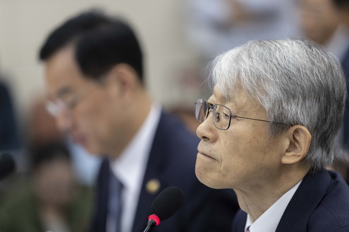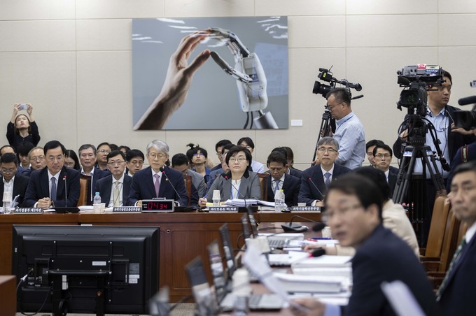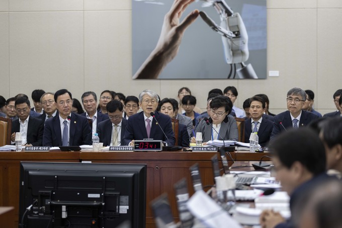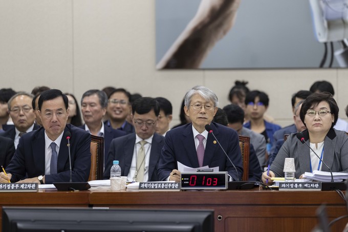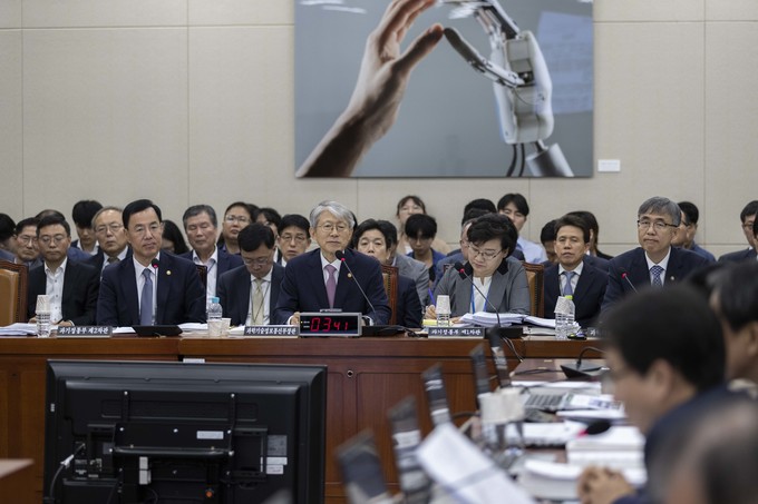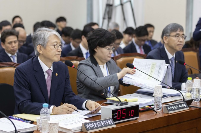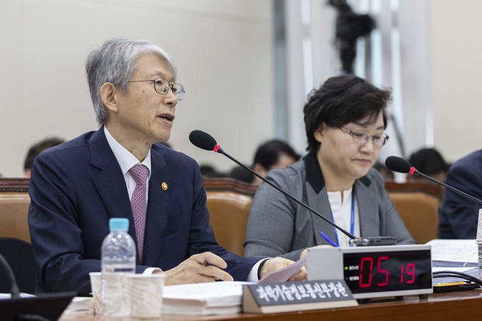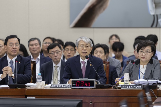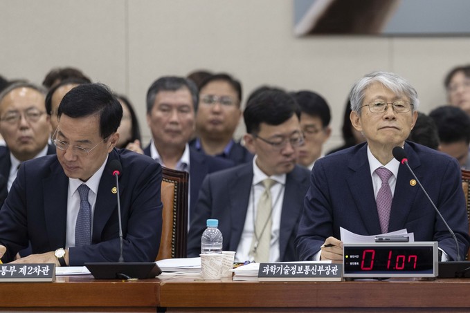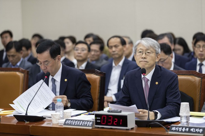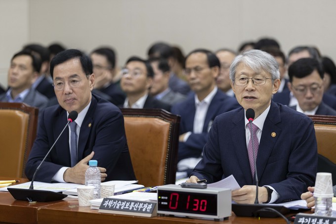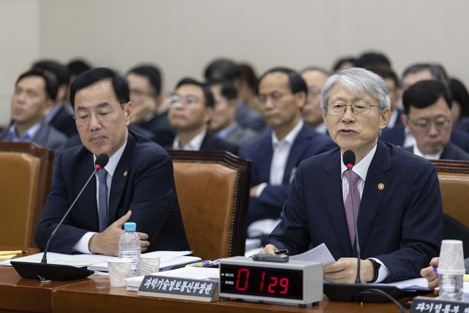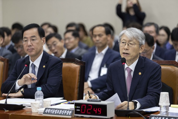 최기영 과학기술정보통신부 장관(오른쪽)이 2일 오전 서울 여의도 국회에서 열린 과학기술정보방송통신위원회의 국정감사에 출석해 의원들의 질의에 답하고 있다.