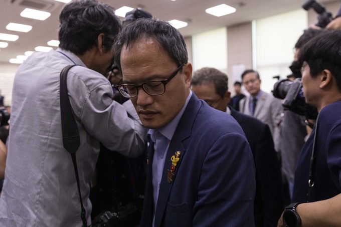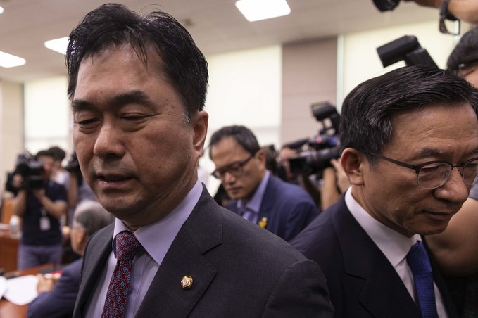2일 오전 서울 여의도 국회에서 열린 법제사법위원회에서 더불어민주당 김종민 위원이 여상규 위원장의 발언에 항의하며 퇴장하고 있다.