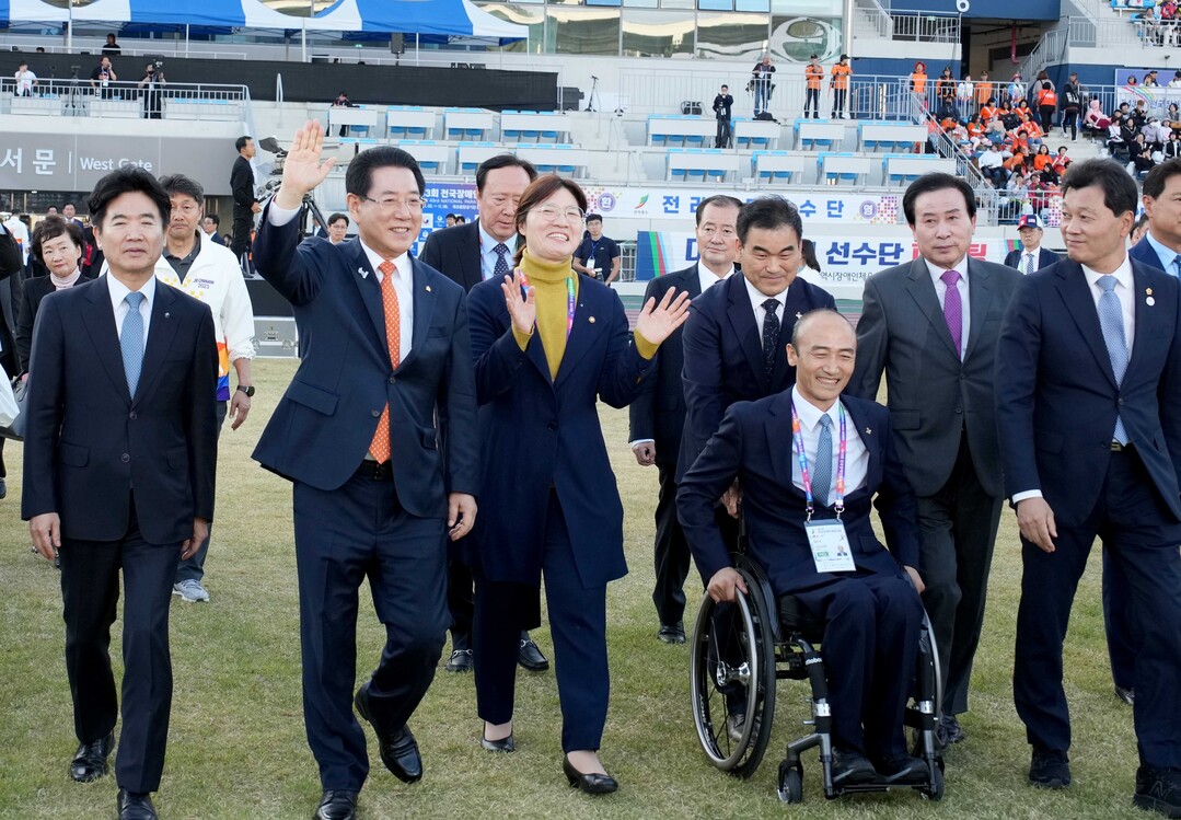 | ▲ 김영록 전라남도지사와 장미란 문체부 제2차관과 지난 3일 오후 목포종합경기장에서 열린 제43회 전국장애인체육대회 개회식에 입장하고 있다. [전남도 제공] |