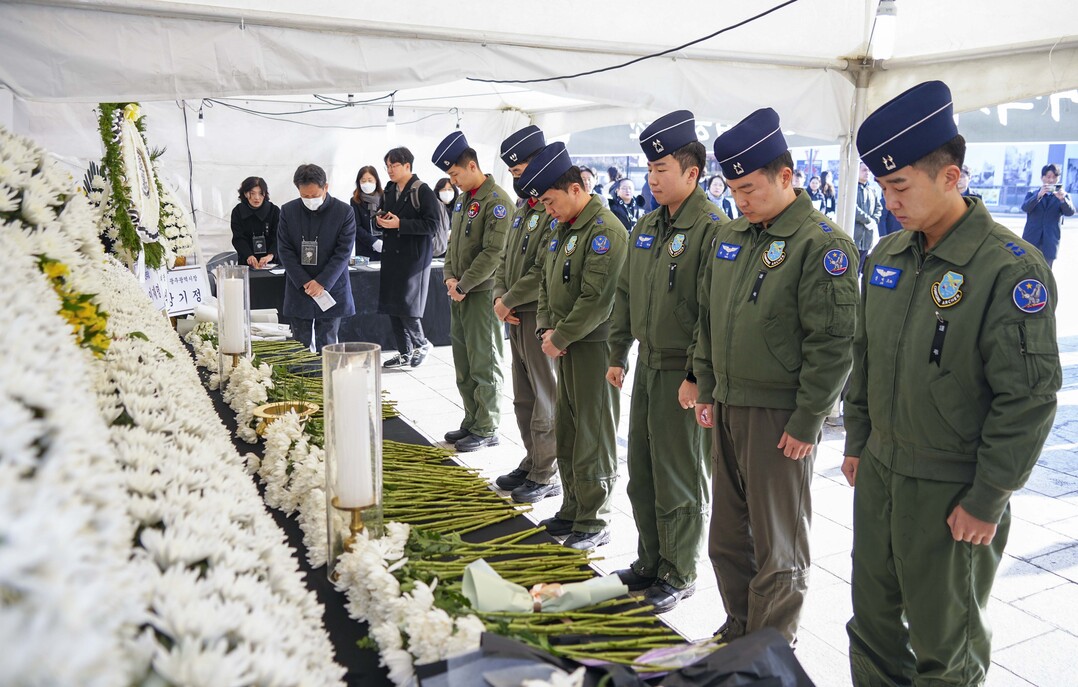 | ▲ 지난 2일 광주광역시 동구 5·18민주광장에 마련된 제주항공 여객기 참사 합동분향소를 찾은 공군제1전투비행단 조종사들이 조문을 하고 있다. [광주광역시 제공] |