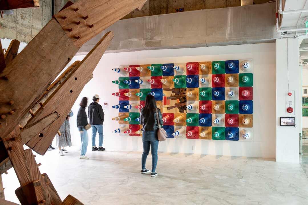 우선 전시장 한 면을 가득 채운 '러버콘'은 특별하다. 공사현장에서 흔히 볼 수 있는 일명 ‘꼬깔콘’ 170여 개를 사용한 대형 설치작품이다. 이 작품에 등장한 오색의 러버콘들은 ‘안전과 보호’를 의미하지만, ‘차단과 봉쇄’도 상징한다. 개인 혹은 그가 속한 계급이나 사회를 보호하기 위한 ‘금줄’ 같은 표식으로도 읽힌다. 작가는 러버콘들 사이에 네모난 거울을 부착했다. 거울에 비친 관객은 자신이 안전한 방에 들어섰다고 느낄 수 있다. 하지만 돌연 관객은 자신이 관속에 있다는 절망에 빠지기도 한다. "과한 보호는 고립을 만들고 그런 고립은 결국 물리적 혹은 사회적 죽음을 야기할 수 있다"고 작가는 경고한다.