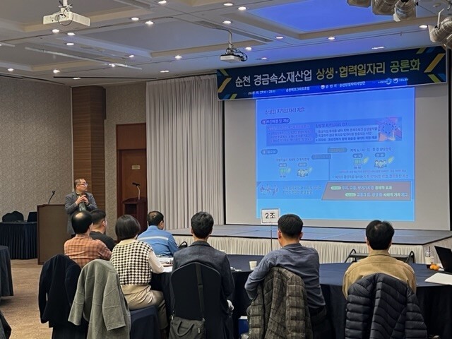 29일 순천시에 따르면 이번 공론화는 마그네슘과 경금속 기업체 산업전문가, 순천시 노사민정 관계자, 학생 등 50여 명이 참석해 순천시 일자리 모델에 대한 토의를 진행했다.