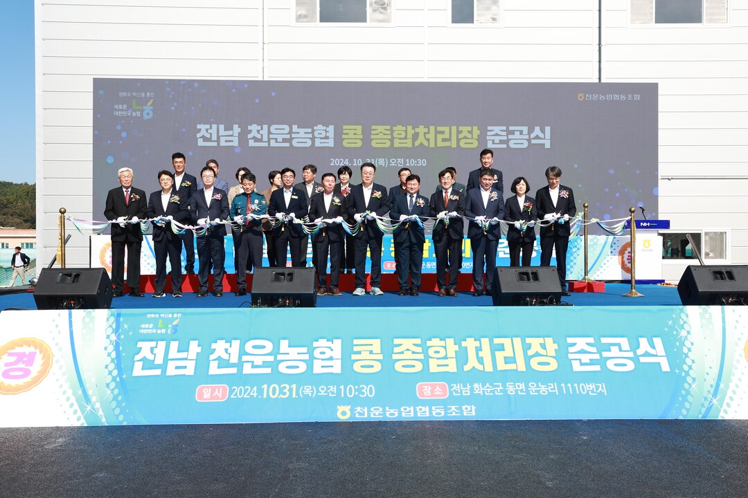 | ▲ 지난달 31일 구복규 전남 화순군수가 농식품부 공모사업 식량작물공동경영체 육성사업에 선정돼 천운농협에 지원한 사업비 35억 원의 '콩 종합처리장' 준공식에 참석한 뒤 테이프 컷팅식을 진행하고 있다. [화순군 제공] |