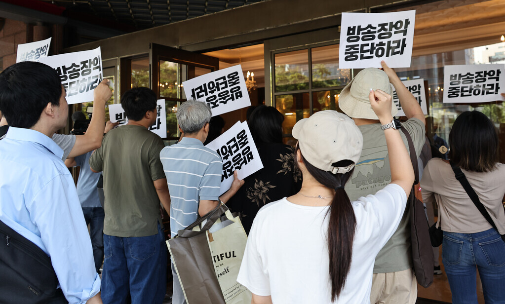 | ▲ 이동관 방송통신위원장의 사퇴를 촉구하는 언론노조와 KBS 등 방송사 노조원들이 11일 오전 방송통신위 방송대상 시상식이 열리고 있는 서울 중구 롯데호텔 로비에서 이동관 방송통신위원장의 사퇴를 촉구하는 구호를 외치고 있다. [이상훈 선임기자] |