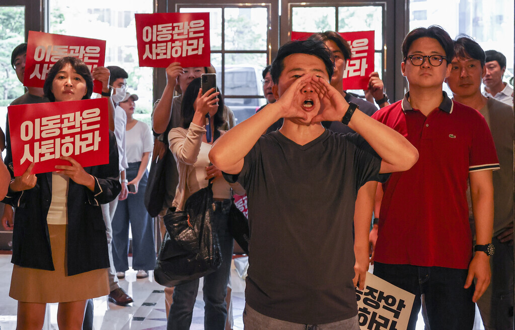 노조원들은 뒤늦게 이 사실을 알고 뒤따라가며 ‘이동관 사퇴’ 등의 구호를 외치기는 했지만