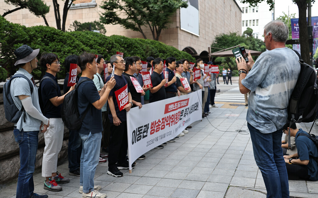 | ▲ 이동관 방송통신위원장의 사퇴를 촉구하는 언론노조와 KBS 등 방송사 노조원들이 11일 오전 방송통신위 방송대상 시상식이 열리고 있는 서울 중구 롯데호텔 앞에서 이동관 방송통신위원장의 사퇴를 촉구하는 기자회견을 지나가던 외국인이 촬영하고 있다. [이상훈 선임기자] |