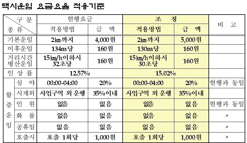 인상 요금 체계에 따르면 중형 택시 기준 기본요금 2km은 5000원으로 조정되며, 거리요금은 기존 134m당 160원에서 130m당 160원으로, 시간요금은(15km/h이하 주행 시) 32초당 160원에서 30초당 160원으로 조정된다.