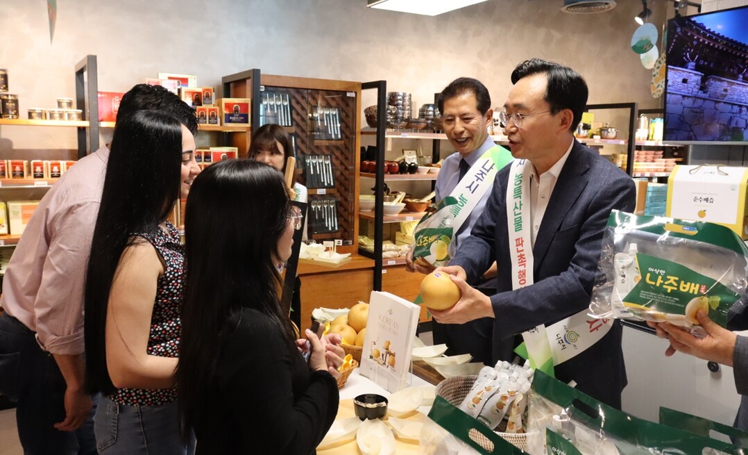 | ▲ 윤병태 나주시장이 두바이 유통업체 ‘1004 GOURMET’에서 나주배 홍보 마케팅 행사에 참여하고 있다. [나주시 제공] |