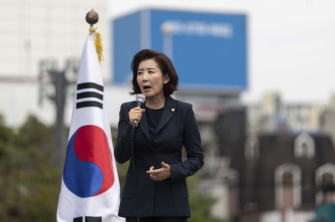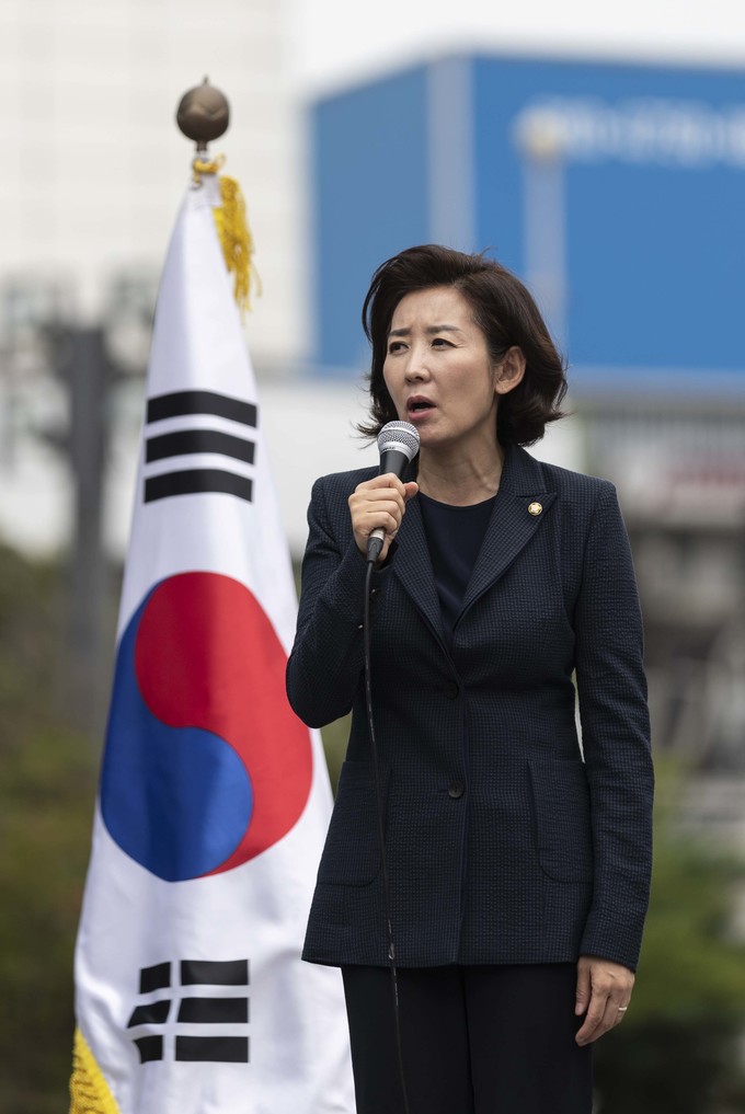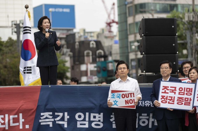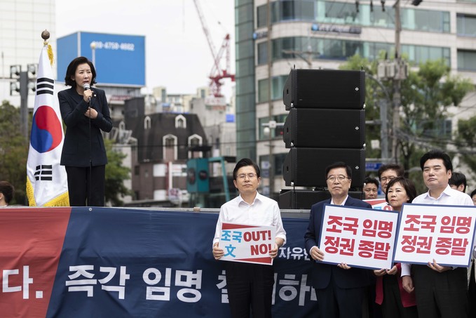 자유한국당 나경원 원내대표가 10일 오후 서울 서대문구 연세로에서 '살리자 대한민국! 문재인 정권 순회 규탄' 대회에 참석해 발언하고 있다.