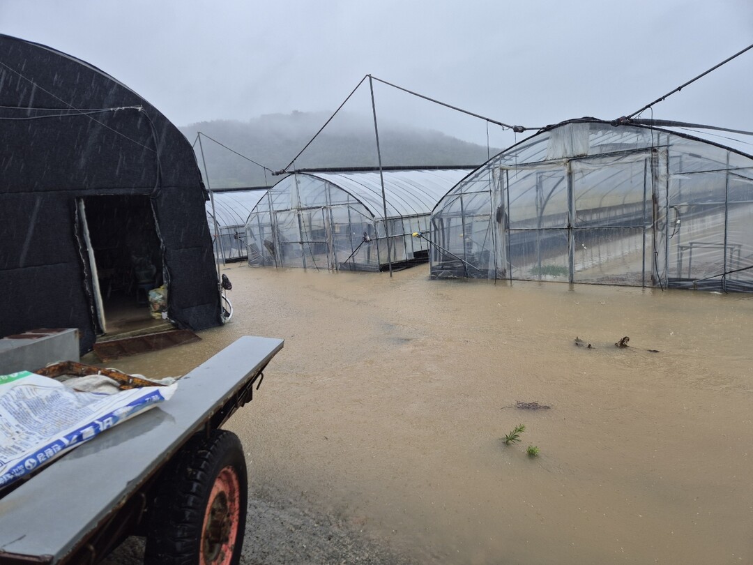 | ▲ 3일 밀양 부북면 오례리 부북들 한 가운데 시설깻잎 비닐하우스가 흙탕물에 잠겨 있다. [부북면 주민 제공] |