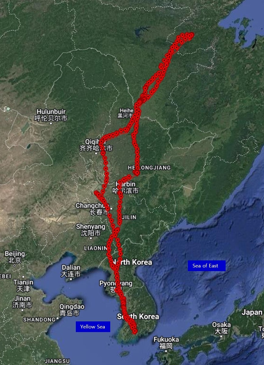 | ▲ 위치추적 통한 흑두루미 이동경로 [순천시 제공] |