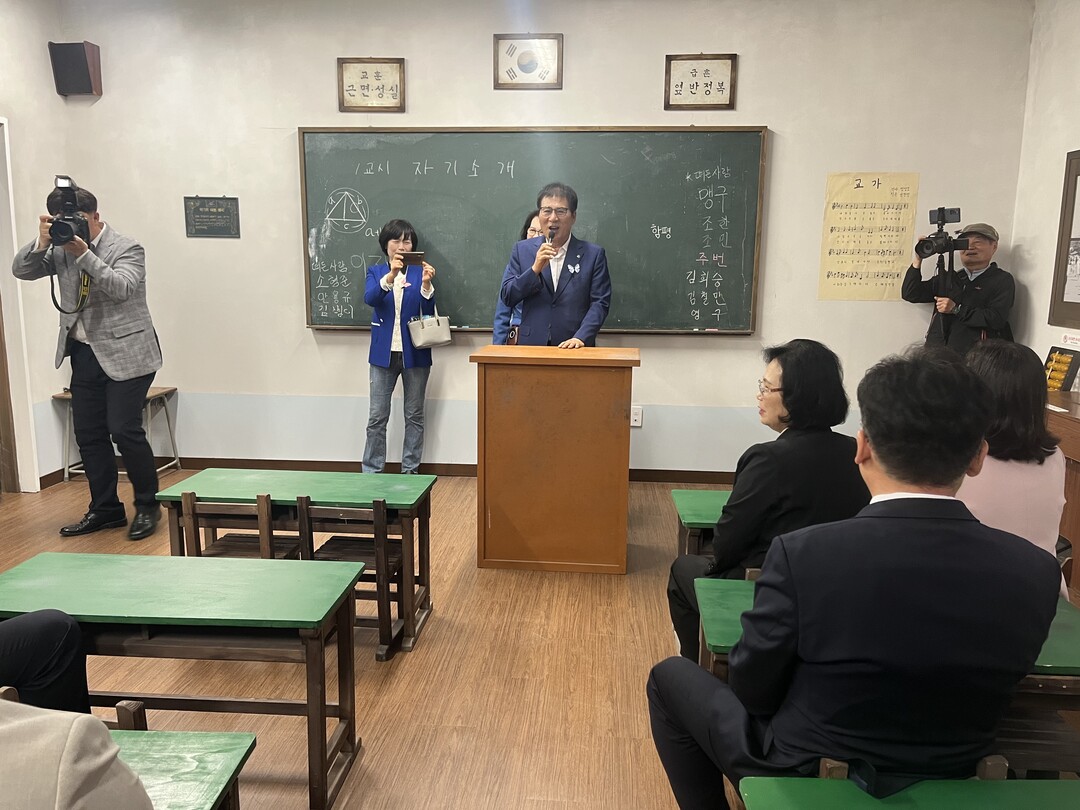 | ▲ 26일 이상익 함평군수가 함평추억공작소에서 옛 교실 선생님 역할을 재연하고 있다. [강성명 기자] |
