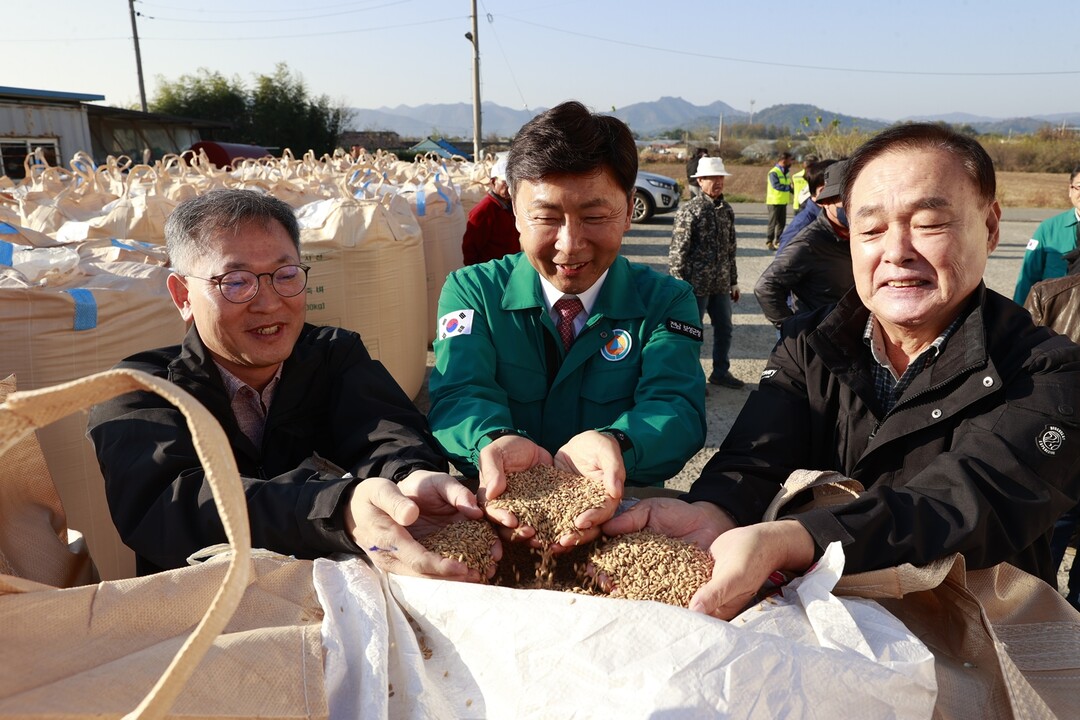 | ▲ 지난 9일 김철우 보성군수가 조성면 소재 가루쌀 생산단지에서 진행된 공공비축미곡 가루쌀 매입 현장을 방문해 나락을 살펴보고 있다. [보성군 제공] |