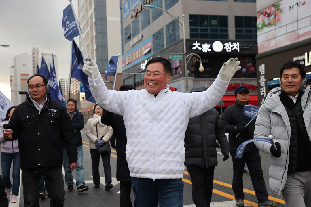 | ▲ 김산 무안군수가 지난 17일 개막한 무안 YD페스티벌 거리행진에서 군민들과 함께 퍼레이드에 참여하며 두팔을 들어 축제를 즐기고 있다. [무안군 제공] |