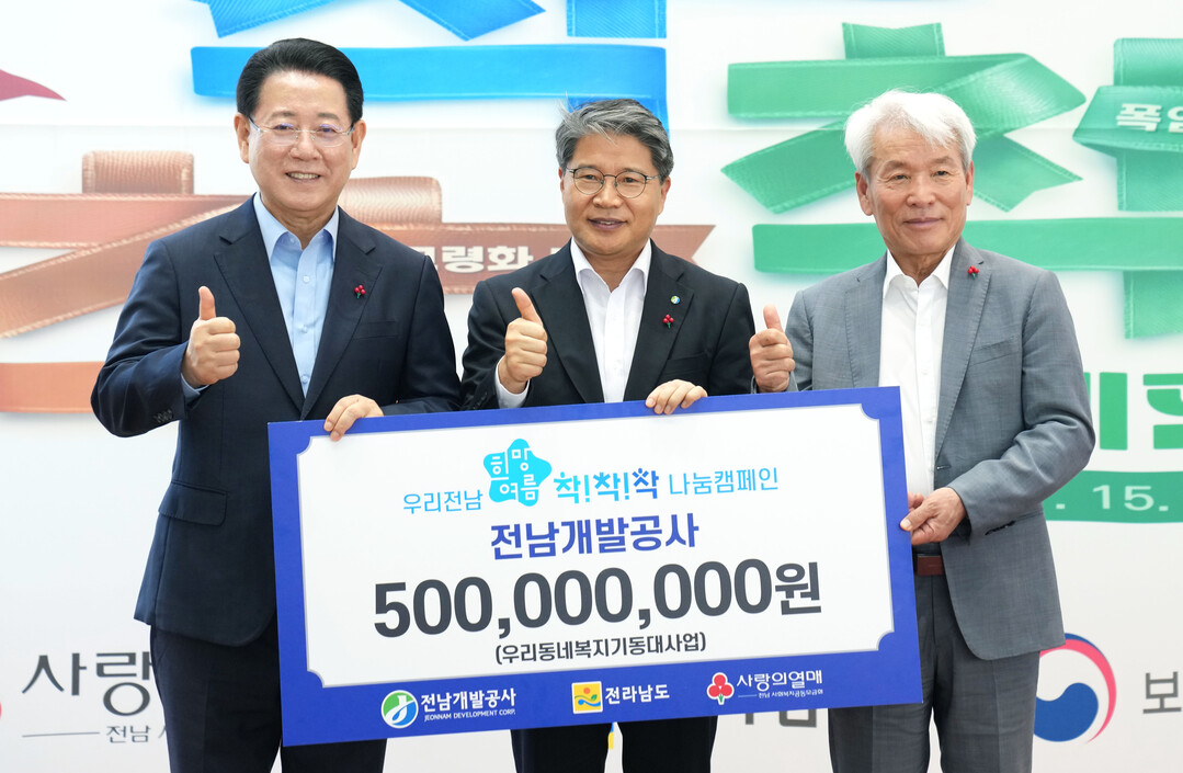 | ▲ 김영록 전라남도지사가 11일 도청 윤선도홀에서 열린 '우리전남 희망여름 착!착!착! 캠페인' 출범식에서 장충모 전남개발공사 사장으로부터 기부금을 기탁받고 있다. [전남도 제공] |