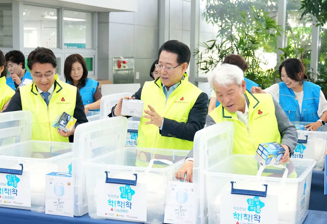 | ▲ 김영록 전라남도지사가 11일 도청 윤선도홀에서 열린 '우리전남 희망여름 착!착!착! 캠페인' 출범식에서 취약계층에게 전달할 여름물품키트를 포장하고 있다. [전남도 제공] |