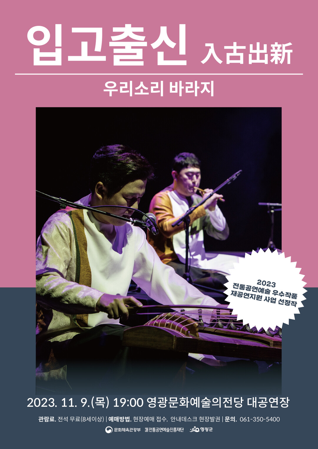 전남 영광군은 오는 9일 저녁 7시 영광문화예술의전당 대공연장에서 ‘우리소리 바라지’의 ‘입고출신’ 전통음악을 공연한다고 6일 밝혔다.
