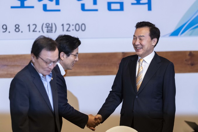 자유한국당 황교안 대표와 바른미래당 손학규 대표가 12일 오후 서울 여의도 국회 사랑재에서 열린 '문희상 국회의장 주최 초월회 오찬 간담회'에 참석해 악수를 하고 있다. 왼쪽부터 더불어민주당 이해찬 대표, 자유한국당 황교안 대표, 바른미래당 손학규 대표.