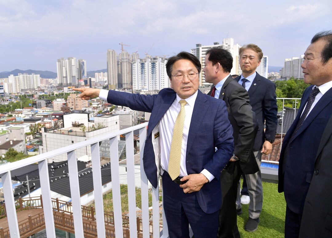 | ▲ 강기정 광주광역시장이 지난해 5월 11일 서구 발산마을 별마루전망대를 방문해 발산근린공원 조성계획 현장을 살펴보고 있다. [광주광역시 제공] |